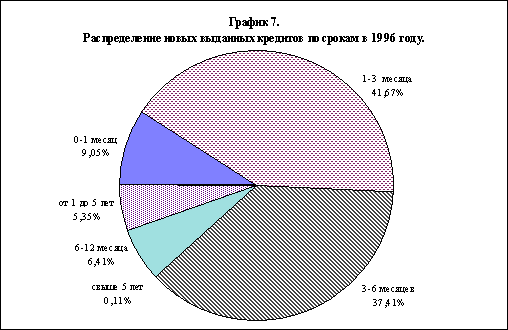 3.2.3. Анализ выданных кредитов по процентным ставкам.В целом в 1996 году процентные ставки на кредиты имели тенденцию к стабилизации. Проценты на кредиты направленные на развитие производственной сферы не превышали 80 % годовых, а минимальной зафиксированной ставкой было 45 %. В группе кредитов выданных сроком от 1 до 5 лет промышленным предприятиям на развитие производства ставка процентов была установлена на уровне 42 - 90 %. А по кредитам сроком свыше 5 лет ставка процентов установилась в 20 %. Очень низкие процентные ставки были отмечены в коммерческой деятельности. Минимальный процент в 33 % годовых был отмечен в группе кредитов выданных сроком от 1 до 3 месяцев. Коммерческая деятельность характеризована коротким сроком обращения денежных средств, хотя отраслевой риск здесь очень высокий, банки справляются с ним требуя от заемщиков ликвидный залог, в размере 120 % и более. Глава 4