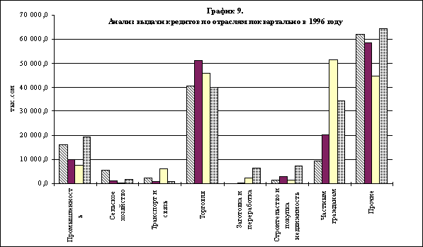 3.2.2. Анализ выданных кредитов по отраслям.В 1996 году банки активно проводили операции на межбанковском кредитном рынке (МБКР) объем которых составил 229 744 тыс. сом (37 % от общей суммы кредитов). В сфере же кредитования отраслей народного хозяйства, наибольший объем кредитных ресурсов было направлено на коммерческие операции торговли (29 % от общей суммы кредитов), 1/3 часть которого была выдана в долларах. Удельный вес кредитов выданных частным гражданам и предпринимателям составил 18,75 % (в основном краткосрочные). Половина кредитов выданное на развитие мелкого предпринимательства было выдано в иностранной валюте (US $). На производственную сферу было направлено 53 088,4 тыс. сом, что составляет 8,62 % от общей суммы выданных кредитов в 1996 году. Доля кредитов данной категории кредитов выданных в иностранной валюте очень низка. Кредитование отраслей сельского хозяйства, заготовки и переработки, строительства и покупки недвижимости проводилось только в национальной валюте. Удельный вес данных кредитов в структуре выданных кредитов составляет: сельское хозяйство - 1,41 %, заготовка и переработка - 1,47 %, строительство и покупка недвижимости - 2,04 %. Кредитные вложения в транспортную отрасль и связь составляет 10 087,1 тыс. сом, удельный вес которой 1,64 % от всех кредитных вложений. Вложения в иностранной валюте составляют 6 627,1 тыс. сом.