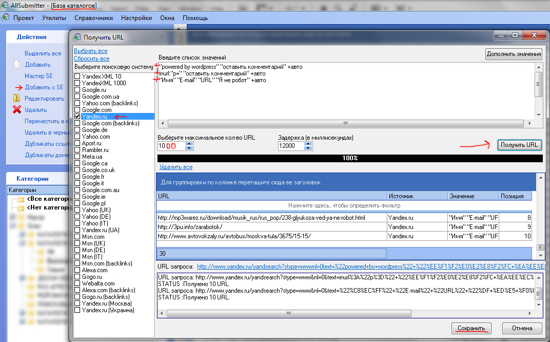 Жмем Добавить с SE, вбиваем наши запросы, выбираем yandex.ru, настраиваем параметры и жмем Получить URL. Когда закончится парсинг, сохраняем наши блоги в отдельную категорию. Далее можно просто экспортировать все ссылки в txt файл, можно отсеять блоги, например, по тИЦу или кол-ву страниц в индексе. Можно сразу приступать к прогону на полуавтомате.